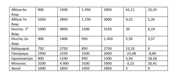 Επιπλέον, σημαντικές αυξήσεις εντοπίζονται σε ζώνες περιοχών, μεταξύ άλλων, όπως το Λαγονήσι, από 750 σε 1.450 ευρώ (αύξηση 93%), το Μαρούσι, από 1.300 σε 2.000 ευρώ (αύξηση 54%), το Χαλάνδρι, από 1.250 σε 1.900 ευρώ (αύξηση 52%), η Κέρκυρα, από 1.050 σε 1.600 ευρώ (αύξηση 52%), και η Νέα Αλικαρνασσός, από 650 σε 900 ευρώ (αύξηση 38%).