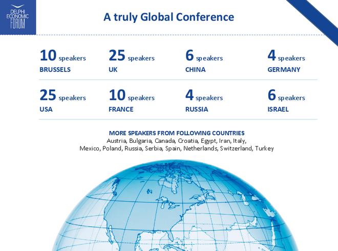 Τον διεθνή χαρακτήρα του Φόρουμ ωστόσο, σύμφωνα με τους διοργανωτές επιβεβαιώνουν τα ονόματα των ομιλητών που προέρχονται από 18 χώρες από όλες τις ηπείρους. Πέραν της Ευρώπης και των Η.Π.Α., στους Δελφούς θα καταφθάσουν 6 ομιλητές από την Κίνα, αλλά και από την Αίγυπτο, το Ιράν και αλλού. Μεταξύ άλλων ξεχωρίζουν τα ονόματα της Προέδρου του Εποπτικού Συμβουλίου της Ευρωπαϊκής Κεντρικής Τράπεζας Ντανιέλ Νουί, της Αναπληρωτή Γενικής Γραμματέως του ΝΑΤΟ Ρόουζ Γκοτμέλερ, του επικεφαλής του Ευρωπαϊκού Μηχανισμού Κλάους Ρέγκλινγκ και του Προέδρου της Ευρωπαϊκής Τράπεζας Επενδύσεων Βέρνερ Χόγιερ.