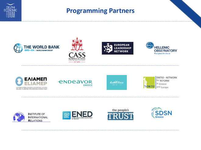 Τις εργασίες του Φόρουμ θα ανοίξει ο Πρόεδρος της Δημοκρατίας, Προκόπης Παυλόπουλος, ενώ αναμένεται η οριστική επιβεβαίωση της συμμετοχής του Πρωθυπουργού Αλέξη Τσίπρα. Ήδη ο Γ. Δραγασάκης, ο Κυριάκος Μητσοτάκης, πρώην πρωθυπουργοί όπως ο Α. Σαμαράς, ο Κ. Σημίτης και ο Γ. Παπανδρέου αλλά και αρκετοί υπουργοί έχουν δεχτεί την πρόσκληση να συμμετάσχουν στις συζητήσεις στους Δελφούς. Πέραν των εκπροσώπων της πολιτικής σκηνής, επικεφαλής των επιχειρηματικών ομίλων αλλά και των περισσότερων τραπεζών θα δώσουν το παρών.