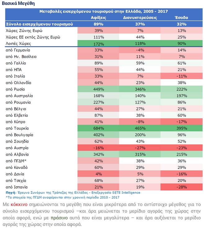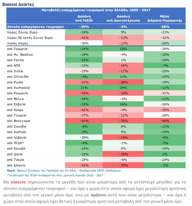 Σημαντικές διψήφιες αυξήσεις καταγράφονται στα βασικά μεγέθη (αφίξεις, διανυκτερεύσεις, έσοδα) του ελληνικού τουρισμού, ενώ αντίθετα οι βασικοί δείκτες Μέση κατά Κεφαλή Δαπάνη (ΜΚΔ) και Μέση Διάρκεια Παραμονής σημειώνουν πτώση. H Μέση Δαπάνη ανά Διανυκτέρευση δείχνει εντυπωσιακή σταθερότητα την ίδια περίοδο με αυξομειώσεις περί τα 70 ευρώ, ενώ μεταξύ 2005 και 2017 μειώνεται οριακά κατά 3%. Επίσης, αξιοσημείωτες είναι οι διαφοροποιήσεις που παρουσιάζονται μεταξύ των χωρών. Για παράδειγμα η μείωση της ΜΚΔ, μεταξύ 2005 και 2017, των τουριστών από τις χώρες της Ζώνης του Ευρώ έφθασε σε ποσοστό 19% έναντι μείωσης κατά 30% συνολικά, ενώ η Μέση Δαπάνη ανά Διανυκτέρευση των τουριστών από τις χώρες της Ζώνης του Ευρώ αυξήθηκε κατά 5% όταν συνολικά για την χώρα μειώθηκε κατά 3%.