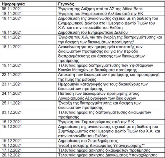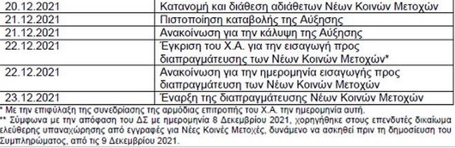 Την ίδια ημέρα θα κατανεμηθούν και θα διατεθούν και οι αδιάθετες νέες μετοχές. Ειδικότερα, το χρονοδιάγραμμα της αύξησης κεφαλαίου διαμορφώνεται ως εξής: