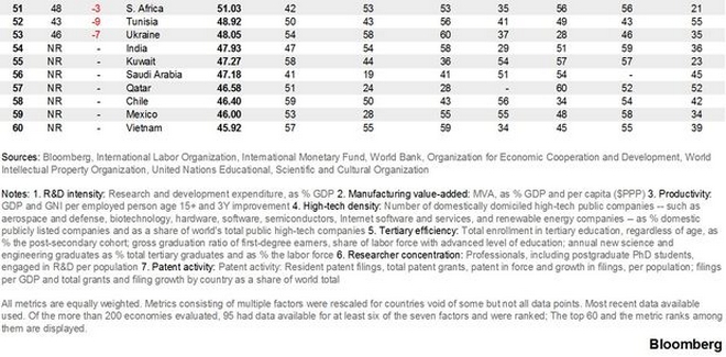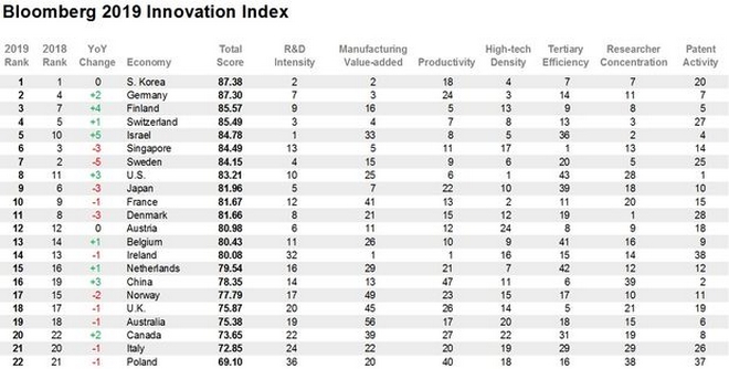 Θα πρέπει να σημειωθεί ότι για να καταρτιστεί η λίστα, στο “μικροσκόπιο” του Bloomberg μπαίνουν 200 οικονομίες από όλον τον κόσμο, οι οποίες βαθμολογούνται σε επτά κατηγορίες, όπως οι δαπάνες για έρευνα και ανάπτυξη, η παραγωγικότητα και η συγκέντρωση εταιρειών υψηλής τεχνολογίας, σε μία κλίμακα από το 0 έως το 100.