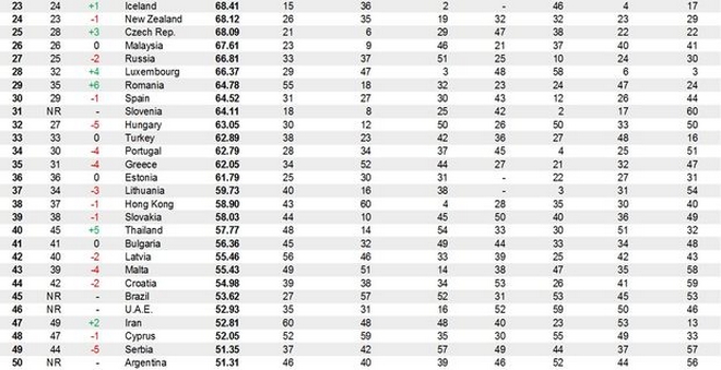 Η υψηλότερη “νέα είσοδος” για φέτος ανήκει στα Ηνωμένα Αραβικά Εμιράτα που κατέλαβαν την 46η θέση, ενώ μια θέση στη λίστα εξασφάλισαν φέτος για πρώτη φορές πολλές αναδυόμενες οικονομίες, όπως η Ινδία, το Κουβέιτ, η Σαουδική Αραβία, το Κατάρ, η Χιλή, το Μεξικό και το Βιετνάμ. Στην λίστα επανέκαμψε μετά από ένα χρόνο απουσίας και η Βραζιλία (45η), ενώ εκτός βρέθηκαν φέτος η Τυνησία και η Ουκρανία.