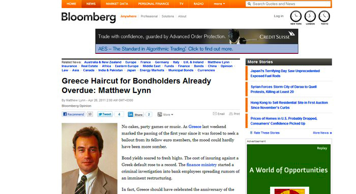 “Θα ήταν καλύτερα (η Ελλάδα) να επιβάλει ένα 40% ή 50% απώλεια για τους κατόχους ομολόγων το τρέχον έτος από το 70% ή 80% το 2013”, σημειώνει χαρακτηριστικά ο αρθρογράφος του Bloomberg Μάθιου Λυν.