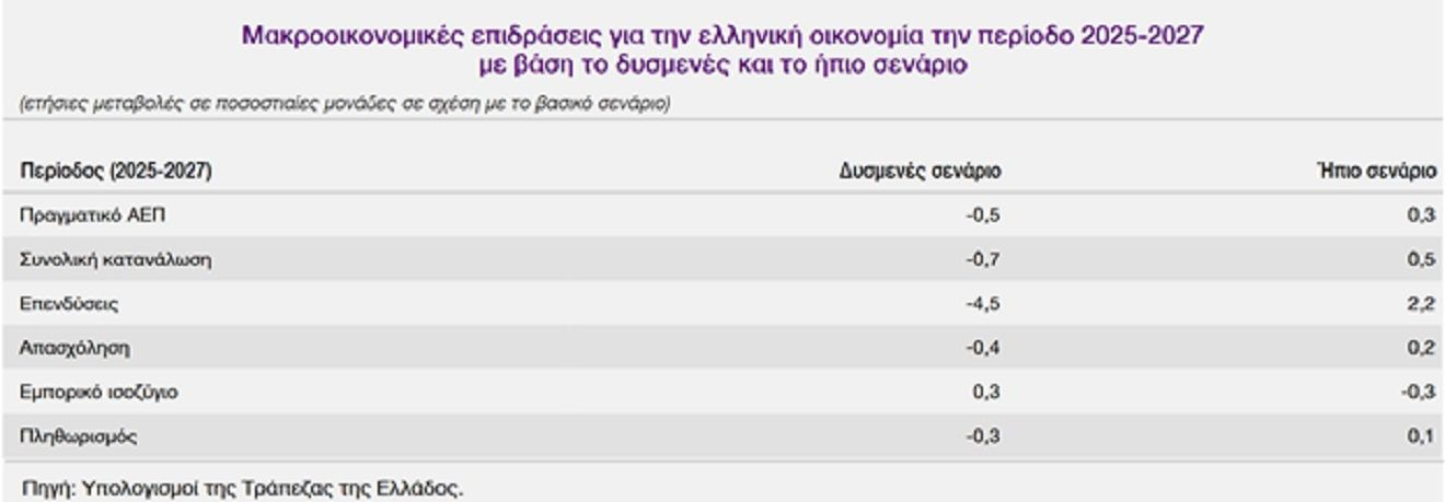 Σε μια προσπάθεια ποσοτικοποίησης των επιπτώσεων της διεθνούς εμπορικής αναταραχής και αβεβαιότητας στην ελληνική οικονομία η Τράπεζα Της Ελλάδας αξιοποιεί δύο σενάρια, το ήπιο και το δυσμενές, που επηρεάζουν τις βασικές προβλέψεις για τα επόμενα έτη.