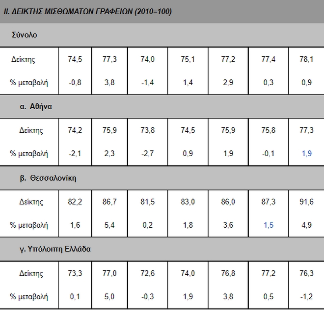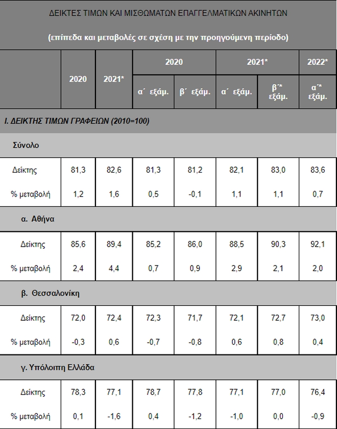 Το α΄ εξάμηνο του 2022, τα μισθώματα των γραφείων για το σύνολο της χώρας αυξήθηκαν κατά 0,9% σε σχέση με το β΄ εξάμηνο του 2021 (προσωρινά στοιχεία). Με βάση τα αναθεωρημένα στοιχεία, τα μισθώματα των γραφείων αυξήθηκαν κατά 2,9% το α΄ εξάμηνο του 2021 και 0,3% το β΄ εξάμηνο του 2021, σε σχέση με το προηγούμενο εξάμηνο. Για το σύνολο του 2021, τα μισθώματα των γραφείων αυξήθηκαν με μέσο ετήσιο ρυθμό 3,8%.