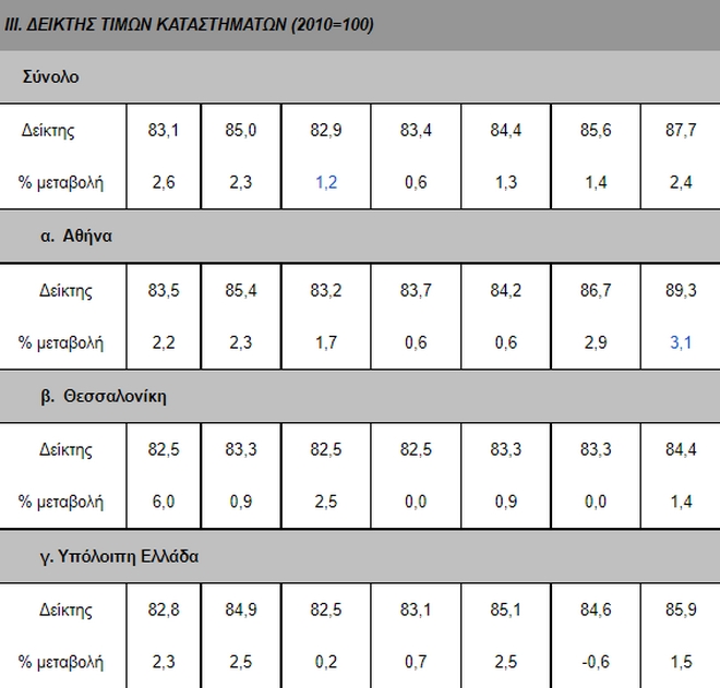 Με βάση τα αναθεωρημένα στοιχεία, το 2021 ο μέσος ετήσιος ρυθμός αύξησης των ονομαστικών τιμών καταστημάτων υψηλών προδιαγραφών διαμορφώθηκε στο 2,3% για το σύνολο της χώρας, ενώ οι αντίστοιχοι ρυθμοί αύξησης των τιμών ήταν 2,3% για την Αθήνα, 0,9% για τη Θεσσαλονίκη και 2,5% για την υπόλοιπη Ελλάδα.