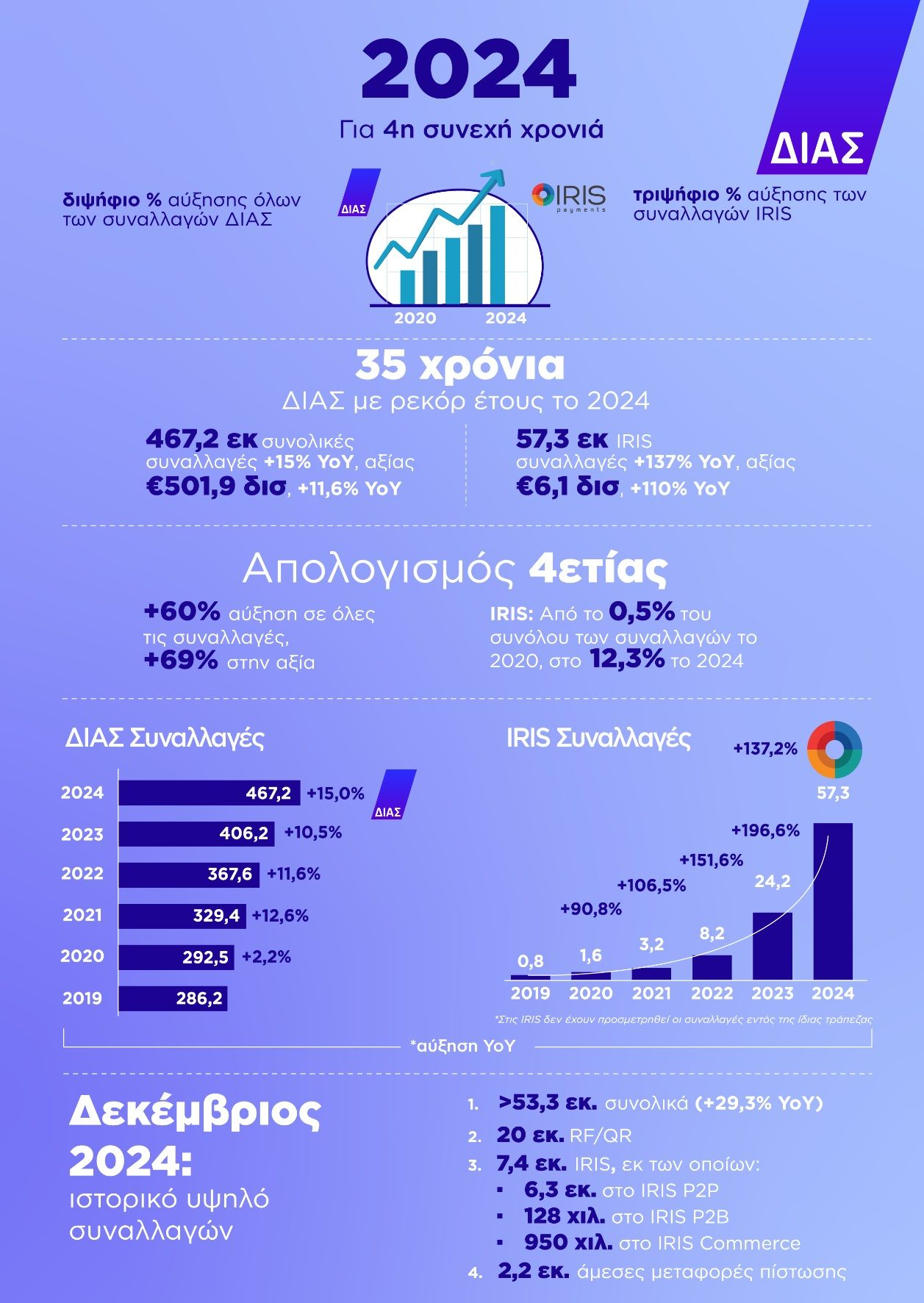 Το 2024 συνεχίστηκε η έντονα ανοδική τροχιά της διατραπεζικής υπηρεσίας IRIS payments, η οποία παρέχεται από τις τράπεζες, σε συνεργασία με τη ΔΙΑΣ Α.Ε., και αποσκοπεί στην εξασφάλιση συναλλαγών με ακόμη μεγαλύτερη ταχύτητα, ευκολία, ευελιξία και ασφάλεια. Στην οικογένεια των υπηρεσιών IRIS Payments περιλαμβάνονται οι άμεσες μεταφορές χρημάτων μεταξύ φίλων (IRIS P2P), μεταξύ επαγγελματιών (IRIS P2B), καθώς επίσης και οι πληρωμές σε ηλεκτρονικό κατάστημα (IRIS eCommerce), οι οποίες κατάφεραν να πετύχουν ιδιαίτερα ισχυρούς ρυθμούς αύξησης συναλλαγών, ύψους 142%, 844% και 94% αντίστοιχα, σε σχέση με τα ανάλογα μεγέθη του 2023.