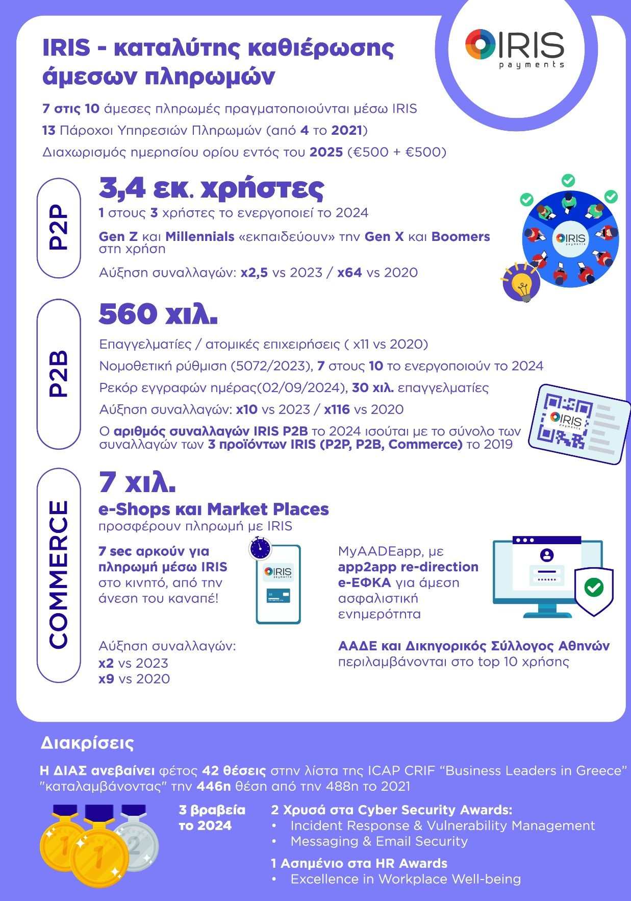 Παράλληλα, οι χρήστες του IRIS P2P ανέρχονταν στις 31/12/2024 σε 3,43 εκατομμύρια (τον Αύγουστο του 2024 κατεγράφη μηνιαίο ρεκόρ εγγραφών με 166 χιλιάδες νέους χρήστες), με το 65% των χρηστών να ανήκουν στην ηλικιακή ομάδα 18-35 ετών. Την ίδια ημέρα (31/12/2024), 557 χιλιάδες ήταν οι εγγεγραμμένοι επαγγελματίες στην υπηρεσία IRIS P2B, μέγεθος αυξημένο κατά 259% εν συγκρίσει με το 2023. Όσο για το πλήθος των εγγεγραμμένων εμπόρων/eshops στην υπηρεσία IRIS eCommerce, ανήλθε σε 6,9 χιλ. το 2024, ενισχυμένο κατά 46 φορές σε σχέση με το 2020.