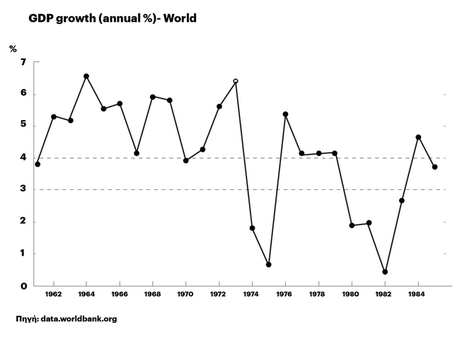 Μετά από τις δεκαετίες του ’50 και του ’60 που η ανάπτυξη ήταν στιβαρή, η δεκαετία του ’70 χαράχτηκε από μια παγκόσμια ύφεση το 1975 και τρεις υφέσεις στις ΗΠΑ (1969-70, 1973-75, 1980). Συνολικά η παγκόσμια ανάπτυξη ήταν κατά μέσο όρο 4,1% τη δεκαετία του ’70 έναντι 5,5% τη δεκαετία του ’60 και 5,1 τη δεκαετία του ’509.