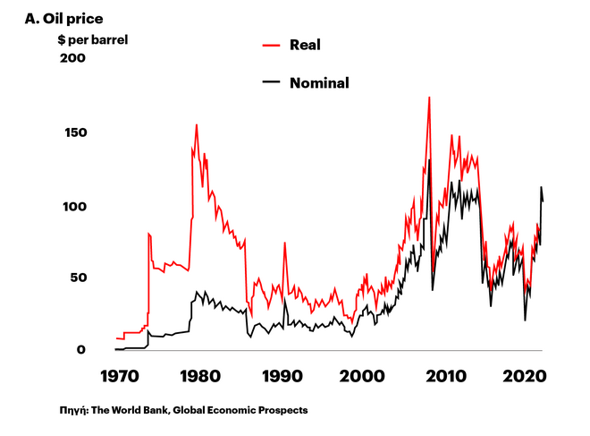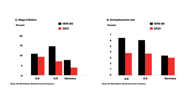 Η Παγκόσμια Τράπεζα επισημαίνει ότι μέχρι τώρα η άνοδος των τιμών των εμπορευμάτων είναι μικρότερη από αυτήν της δεκαετίας του ’70. Το 1973-74 οι τιμές του πετρελαίου τετραπλασιάστηκαν και διπλασιάστηκαν το 1979-80. Μέχρι τον Μάη οι τιμές του πετρελαίου είχαν τριπλασιαστεί από το χαμηλό τους το 2020, αλλά παρέμειναν στα 2/3 των τιμών της δεκαετίας του ’80. Ο δε δομικός πληθωρισμός (πληθωρισμός χωρίς την ενέργεια και τα τρόφιμα) παραμένει σχετικά χαμηλός σε όλες τις χώρες. Υπάρχει ελπίδα λοιπόν ότι να διορθωθούν οι δυσλειτουργίες στις εφοδιαστικές αλυσίδες, ο πληθωρισμός μπορεί να περιοριστεί. Πάντως η Παγκόσμια Τράπεζα επισημαίνει ότι σήμερα η ανεργία είναι χαμηλότερη από ό,τι ήταν στα τέλη της δεκαετίας του ’70, κάτι που μπορεί να σημαίνει πίεση στις τιμές κι αιτήματα για αυξήσεις -εδώ φαίνεται καθαρά πώς οι επιλογές της δεκαετίας του ’70 έχουν διαμορφώσει το πλαίσιο της σύγχρονης οικονομικής πολιτικής.