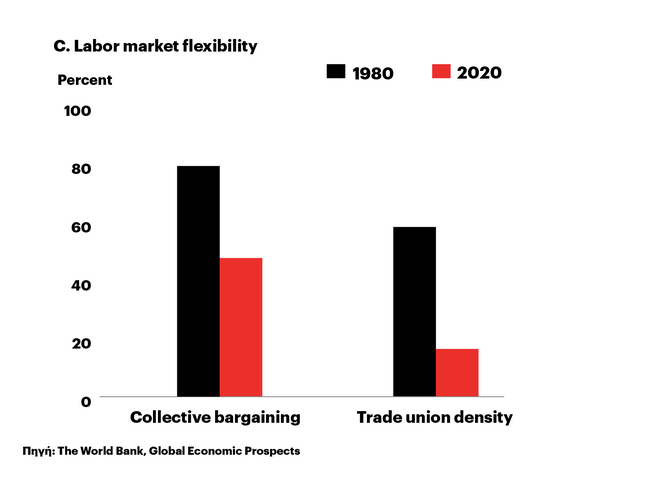 Η Παγκόσμια Τράπεζα θεωρεί πολύ σημαντικό ότι πλέον δεν υπάρχουν οι «δομικές ανελαστικότητες» της δεκαετίας του ’70 -δηλαδή έχουν επικρατήσει πλήρως οι νεοφιλελεύθερες πολιτικές. Το χαρακτηριστικό παράδειγμα «ανελαστικοτήτων» που δίνει, είναι οι συλλογικές συμβάσεις. Τη δεκαετία του ’70 κάλυπταν τα 4/5 των εργαζομένων, ενώ το 2020 μόνο το ½ των εργαζομένων στις χώρες του ΟΟΣΑ καλύπτονται από συλλογικές συμβάσεις. Επιπλέον, η Παγκόσμια Τράπεζα θεωρεί μεγάλης σημασίας την άρση των ελέγχων τιμών παντού στον κόσμο. Τέλος, σημειώνει ότι η στις αναπτυγμένες οικονομίες έχει αυξηθεί η ενεργειακή αποδοτικότητα και έχει μειωθεί η εξάρτηση από το πετρέλαιο σε σχέση με τη δεκαετία του ’70.