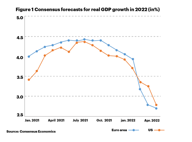Η Παγκόσμια Τράπεζα προβλέπει παγκόσμια ανάπτυξη 2,9% για το 2022 από 5,7% το 2021. Ο κορυφαίος οικονoμολόγος Άνταμ Τουζ επισημαίνει ότι αυτή είναι η πιο απότομη επιβράδυνση μετα-υφεσιακής ανάκαμψης τα τελευταία 80 χρόνια3. Στην Ευρωπαϊκή Ένωση η πραγματική ανάπτυξη αναμένεται να πέσει κάτω από το 3% έναντι 4% που προέβλεπε αρχικά η Ευρωπαϊκή Επιτροπή.