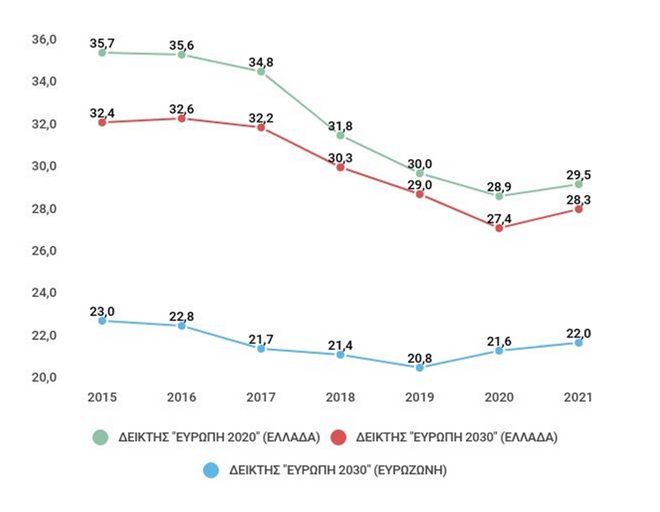 Στο επόμενο διάγραμμα παρουσιάζεται η εξέλιξη του ποσοστού του πληθυσμού σε κίνδυνο φτώχειας ή κοινωνικού αποκλεισμού στην Ελλάδα και την Ευρωζώνη[2] από το 2015 (εισοδήματα του 2014) μέχρι το 2021 (εισοδήματα του 2020) υπολογισμένο με βάση τον ορισμό των προγραμμάτων “Ευρώπη 2020” και “Ευρώπη 2030”.