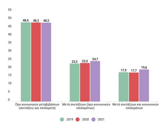 Πριν τις κοινωνικές μεταβιβάσεις (συντάξεις και κοινωνικά επιδόματα) το ποσοστό είναι 48,2%, ελαφρώς βελτιωμένο σε σχέση με το προηγούμενο έτος (48,3%). Μετά τις κοινωνικές μεταβιβάσεις το ποσοστό γίνεται 19,6% (17,7% το 2020), δηλαδή μειώνεται κατά 28,6 ποσοστιαίες μονάδες από τις οποίες, 5,1 οφείλονται στην καταβολή κοινωνικών επιδομάτων και 23,5 ποσοστιαίες μονάδες στις συντάξεις.