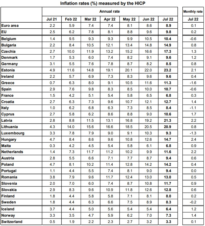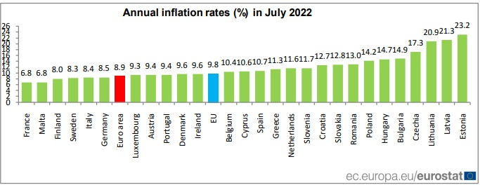 Ο ετήσιος πληθωρισμός της Ευρωπαϊκής Ένωσης ήταν 9,8% τον Ιούλιο του 2022, από 9,6% τον Ιούνιο. Ένα χρόνο νωρίτερα, το ποσοστό ήταν 2,5%.