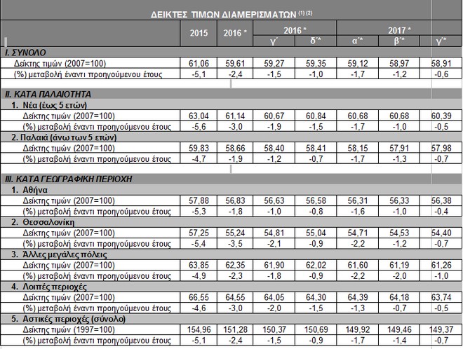 Όπως ανακοίνωσε η Τράπεζα της Ελλάδος, με βάση τα στοιχεία που έχουν συγκεντρωθεί από τα πιστωτικά ιδρύματα, εκτιμάται ότι το γ΄ τρίμηνο του 2017 οι τιμές των διαμερισμάτων (σε ονομαστικούς όρους) ήταν κατά μέσο όρο μειωμένες κατά 0,6% σε σύγκριση με το αντίστοιχο τρίμηνο του 2016. Με βάση τα αναθεωρημένα στοιχεία, το α΄ και β΄ τρίμηνο του 2017 η μείωση διαμορφώθηκε σε 1,7% και 1,2% αντίστοιχα, ενώ για το σύνολο του 2016 οι τιμές των διαμερισμάτων μειώθηκαν με μέσο ετήσιο ρυθμό 2,4%.