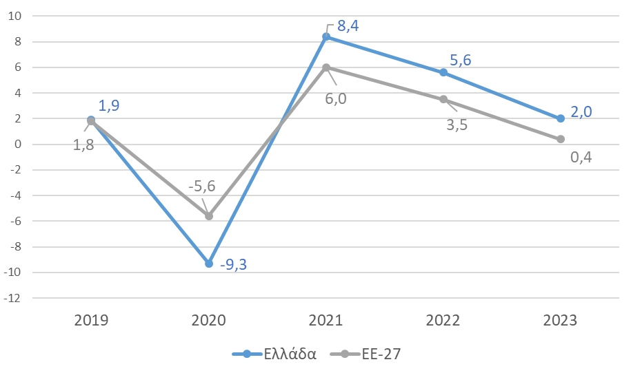 Ξεκινώντας από τους ρυθμούς μεγέθυνσης, το διάγραμμα 1 δείχνει την εξέλιξή τους από το 2019 έως το 2023.