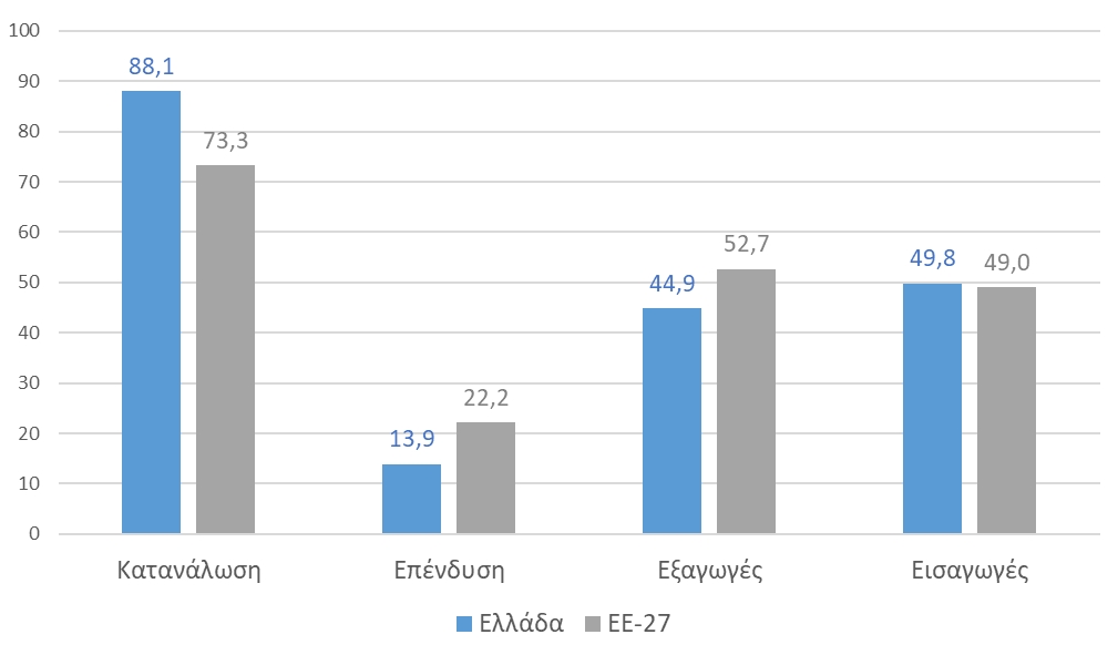 Με βάση τα στοιχεία του 2023, το ελληνικό ΑΕΠ χαρακτηρίζεται από σαφώς υψηλότερο ποσοστό Κατανάλωσης και αντίστοιχα χαμηλότερα ποσοστά Επενδύσεων και Εξαγωγών. Συγκεκριμένα, η Κατανάλωση υπερβαίνει τον μέσο όρο της Ευρωπαϊκής Ένωσης κατά σχεδόν 15 μονάδες ενώ οι Επενδύσεις και οι Εξαγωγές υστερούν κατά 8 περίπου μονάδες. Πρόκειται για μια διαχρονική ιδιαιτερότητα της ελληνικής οικονομίας: το συντριπτικά μεγαλύτερο μέρος του ΑΕΠ καταλήγει στην Κατανάλωση περιορίζοντας εκείνο που απομένει για Επενδύσεις και σχηματισμό κεφαλαίου που θα αύξανε τις μελλοντικές παραγωγικές δυνατότητες. Επίσης, οι χαμηλές εξαγωγικές επιδόσεις της ελληνικής οικονομίας, σε συνδυασμό με τις υψηλές εισαγωγές, εξηγούν την επιδείνωση του ισοζυγίου τρεχουσών συναλλαγών των τελευταίων ετών.