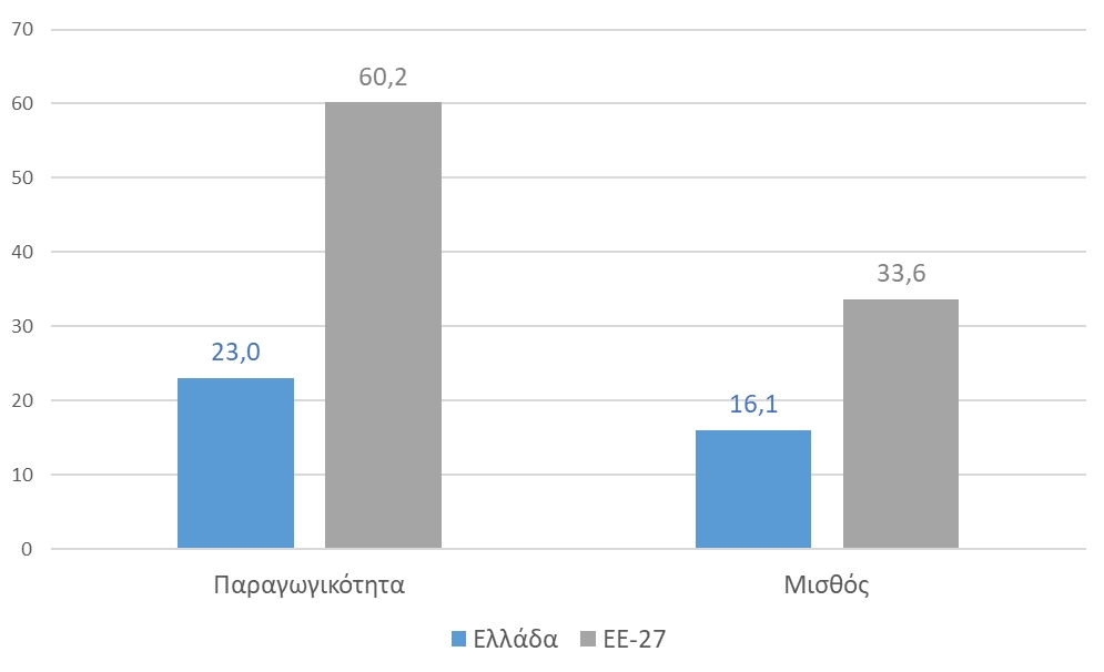 Όπως φαίνεται, η ελληνική οικονομία παρουσιάζει σοβαρή υστέρηση παραγωγικότητας σε σχέση με την ΕΕ. Συγκεκριμένα, σύμφωνα με τα πιο πρόσφατα στοιχεία του 2021, κάθε απασχολούμενος στην Ελλάδα παρήγαγε αξία 23 χιλιάδων ευρώ ετησίως, έναντι 60,2 χιλιάδων ευρώ στην ΕΕ, δηλαδή βρίσκονταν στο 38,3% του μέσου όρου. Αυτή η υστέρηση παραγωγικότητας, σε συνδυασμό με την άνιση διανομή, είναι και ο βασικότερος λόγος του χαμηλότερου μισθού στη χώρα μας που φτάνει τις 16,1 χιλιάδες ευρώ ετησίως έναντι 33,6 χιλιάδων ευρώ στην ΕΕ, δηλαδή στο 48% του μέσου όρου.