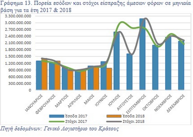 Ωστόσο καταγράφεται κόπωση στους άμεσους φόρους Στο πρώτο εξάμηνο του 2018 και σε ότι αφορά στους άμεσους φόρους, η επίτευξη του εξαμηνιαίους στόχου παρουσίασε υστέρηση κατά 4,08% το 2018 έναντι υπέρβασης 1,93% το 2017, ενώ η επίτευξη του ετήσιου στόχου ανήλθε σε 31,23 % το 2018 έναντι 31,08 % το 2017.