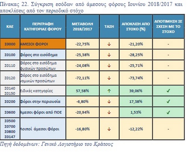 Από τον φόρο στο εισόδημα κατά 170, 36 εκατ. ευρώ και στην ταυτόχρονη μείωση των αντίστοιχων φορολογικών εσόδων κατά 88,08 εκατ. ευρώ το πρώτο εξάμηνο του 2018 σε σχέση με την αντίστοιχη περίοδο του 2017. Όλα αυτά την στιγμή που ο ετήσιος στόχος σε επίπεδο έτους μειώθηκε για τους άμεσους φόρους κατά 3,04% (σε 20,87 δισ. ευρώ το 2018 έναντι 21,53 δισ. ευρώ το 2017).