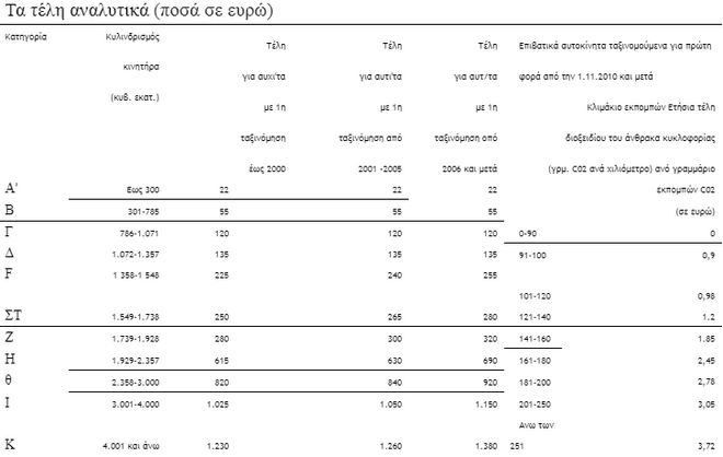 Τα τέλη ανά κατηγορία έχουν ως εξής:
