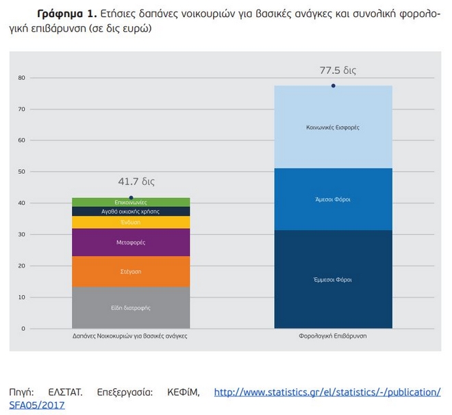 Ο μέσος όρος ετήσιων δαπανών των ελληνικών νοικοκυριών για την κάλυψη των βασικών αναγκών (διατροφή, ένδυση, στέγαση, οικιακά αγαθά, μεταφορές και επικοινωνίες) ανέρχεται σε 42 δις ευρώ, την ίδια ώρα που η συνολική φορολογική επιβάρυνση των Ελλήνων πολιτών και των επιχειρήσεων αγγίζει τα 78 δις ευρώ.
