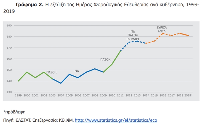 Η μεγάλη φορολογική επιβάρυνση των πολιτών μέσα στον χρόνο αποτυπώνεται στο Γράφημα 2. Από το 1999 ως το 2008, οι Έλληνες πολίτες κάθε χρόνο που περνούσε εργάζονταν κατά μέσο όρο 1 ημέρα παραπάνω για το κράτος. Κατά την περίοδο της δημοσιονομικής κρίσης (2009 μέχρι σήμερα), κάθε χρόνος που περνάει προσθέτει στον κάθε πολίτη κατά μέσο όρο 3,5 ημέρες εργασίας για το κράτος.