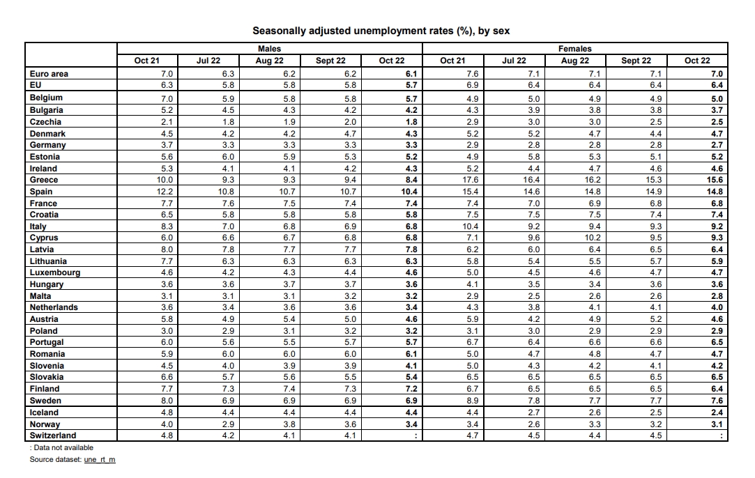 Τον Οκτώβριο του 2022, το ποσοστό ανεργίας για τις γυναίκες ήταν 6,4 % στην ΕΕ, σταθερό σε σύγκριση με τον Σεπτέμβριο του 2022. Το ποσοστό ανεργίας για τους άνδρες ήταν 5,7 % τον Οκτώβριο του 2022, από 5,8 % τον προηγούμενο μήνα.
