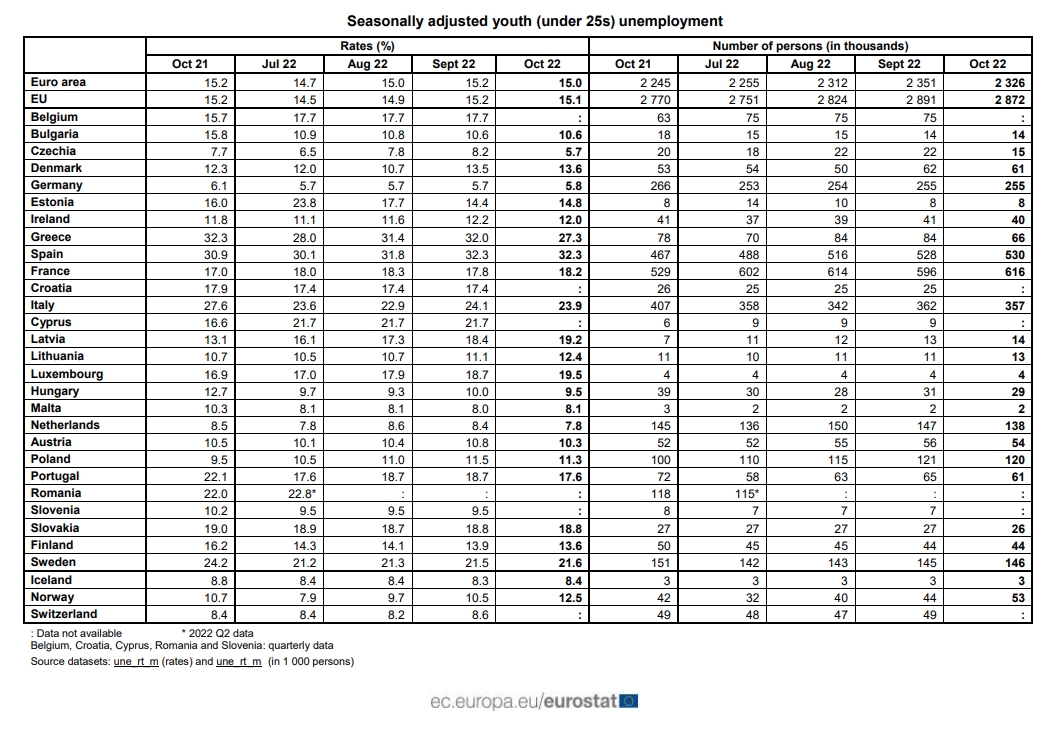 Τον Οκτώβριο του 2022, το ποσοστό ανεργίας των νέων ήταν 15,1 % στην ΕΕ και 15,0 % στη ζώνη του ευρώ, αμφότερα από 15,2 % τον προηγούμενο μήνα. Σε σύγκριση με τον Οκτώβριο του 2021, η ανεργία των νέων αυξήθηκε κατά 102 χιλιάδες στην ΕΕ και κατά 81 χιλιάδες στην ευρωζώνη.
