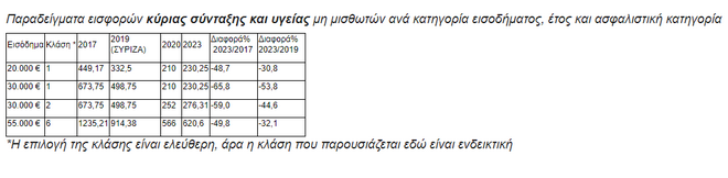 Από τα παραδείγματα. Με βάση ανακοίνωση, «προκύπτει ότι οι εισφορές το 2023 μετά την αναπροσαρμογή είναι σημαντικά χαμηλότερες σε σχέση με εκείνες που επέβαλε το 2017 ο νόμος Κατρούγκαλου, αλλά και με τις εισφορές που καθιερώθηκαν το 2019 από την προηγούμενη κυβέρνηση, μετά από την θύελλα αντιδράσεων που προκάλεσε ο νόμος Κατρούγκαλου.