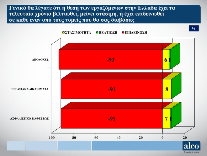 Σύμφωνα με τα ευρήματα της έρευνας κορυφαία προβλήματα είναι η μείωση των αποδοχών σε ποσοστό 65% και η ανασφάλεια για τη διατήρηση της θέσης εργασίας σε ποσοστό 50%, προβλήματα που πλήττουν καθοριστικά τους εργαζόμενους αλλά και την ίδια την έννοια της εργασίας, που θεωρείται από την συντριπτική πλειοψηφία (85%) της κοινής γνώμης κοινωνικό αγαθό.