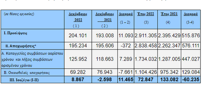 Έτσι, το ισοζύγιο των ροών μισθωτής απασχόλησης του 2022 του έτους ήταν θετικό κατά 72.847 θέσεις εργασίας.