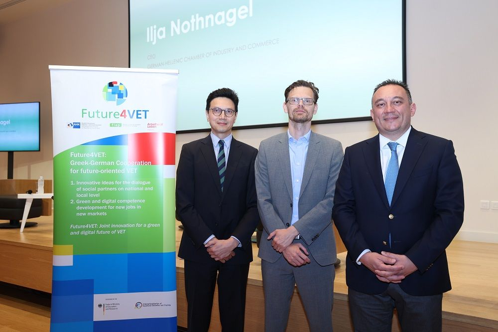 Νωρίτερα, ο Dr Ilja Nothnagel, γενικός διευθυντής και μέλος ΔΣ του Ελληνογερμανικού Επιμελητηρίου, στον σύντομο χαιρετισμό του επεσήμανε, μεταξύ άλλων, ότι η συνεργασία των δυο υπουργείων είναι εξαιρετική και σημείωσε, ότι οι προκλήσεις είναι κοινές και μπορεί η μια πλευρά να διδαχθεί από την άλλη, ενώ σημείωσε ότι χρειαζόμαστε έργα που να ενθουσιάσουν τους νέους. Τέλος, πρόσθεσε ότι στο DNA του Ελληνογερμανικού Επιμελητήριου είναι «γραμμένο» να αναλαμβάνει πρωτοβουλίες από κοινού με τις επιχειρήσεις, έχοντας στόχο τη δια βίου μάθηση των εργαζομένων.
