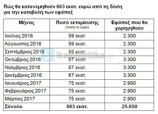 Όπως γίνεται αντιληπτό στον πίνακα που ακολουθεί, ο προγραμματισμός των αρμόδιων υπηρεσιών προβλέπει την καταβολή 2.300 εφάπαξ για κάθε έναν από τους μήνες Ιούλιο, Αύγουστο και Σεπτέμβριο, 3.300 εφάπαξ για Οκτώβριο, Νοέμβριο και Δεκέμβριο και 2.950 εφάπαξ για τους τρεις πρώτους μήνες του 2017 (Ιανουάριο, Φεβρουάριο και Μάρτιο).