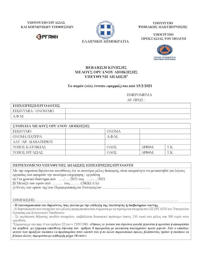 Τέλος, με νέο έντυπο, μέσω του Π.Σ. «ΕΡΓΑΝΗ», θα μπορούν επίσης να μετακινούνται τα μέλη οργάνου διοίκησης, κατόπιν υπεύθυνης δήλωσης της επιχείρησης που μετέχουν.