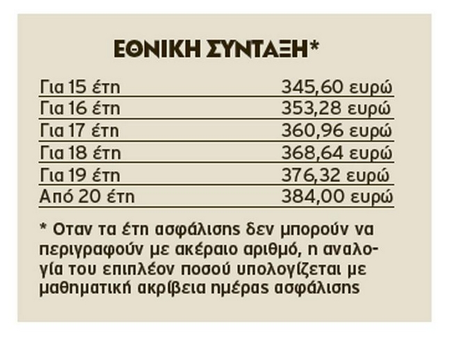 Η νέα σύνταξη είναι το άθροισμα της εθνικής και της ανταποδοτικής. Το πλήρες ποσό της εθνικής σύνταξης είναι 384 ευρώ και καταβάλλεται εφόσον έχουν συμπληρωθεί τουλάχιστον 20 έτη ασφάλισης. Οσοι αποχωρούν με 15-20 έτη θα λάβουν εθνική σύνταξη μειωμένη κατά 2% για κάθε έτος που υπολείπεται της 20ετίας και επίσης ποσό αυστηρά αναλογικό των ετών, μηνών και ημερών ασφάλισης που έχουν.