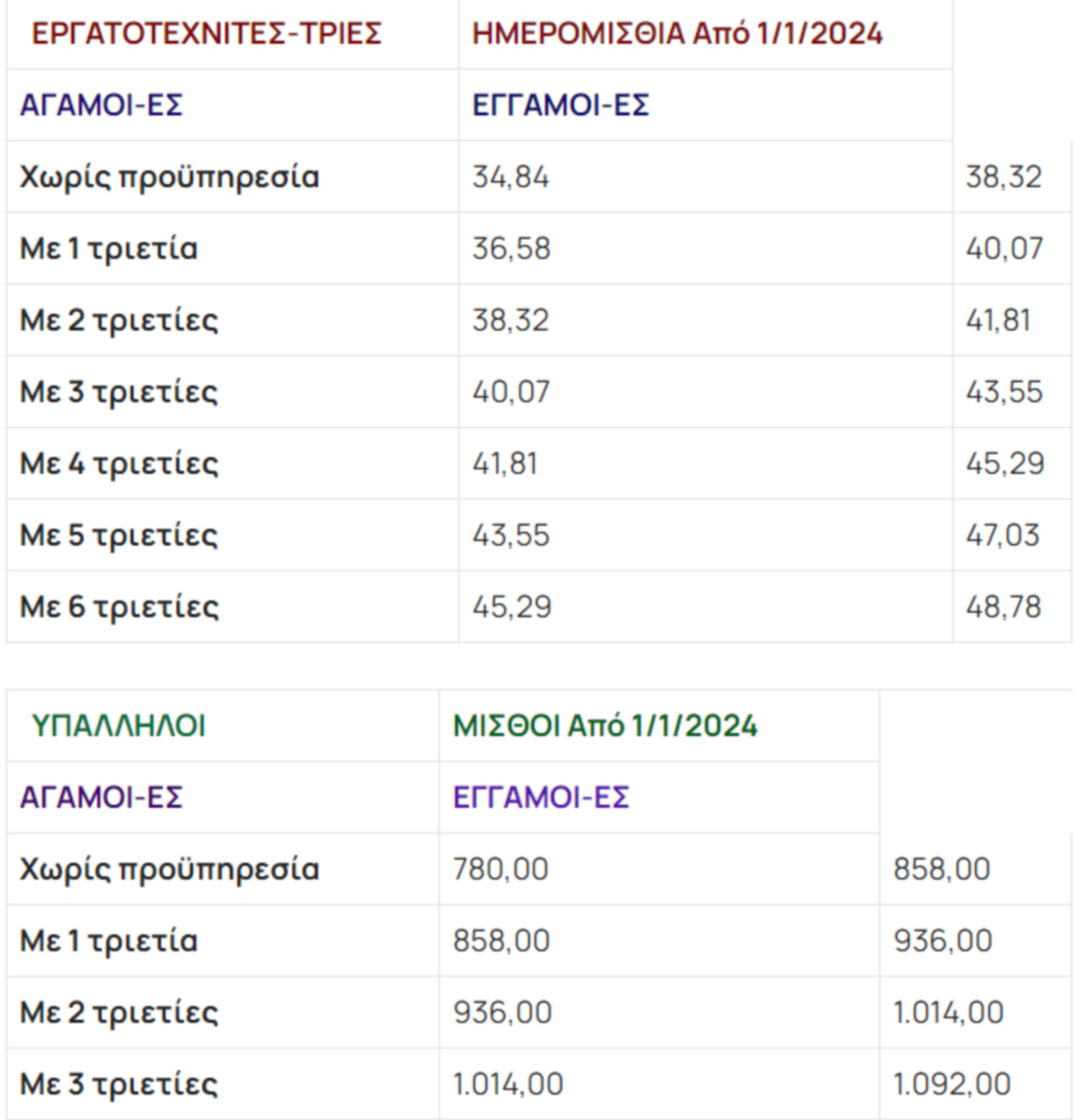 Αναλυτικούς πίνακες με τη διαμόρφωση του κατώτατου μισθού και ημερομισθίου, με προσαυξήσεις τριετιών και επιδόματος γάμου, παραθέτει η ΓΣΕΕ.