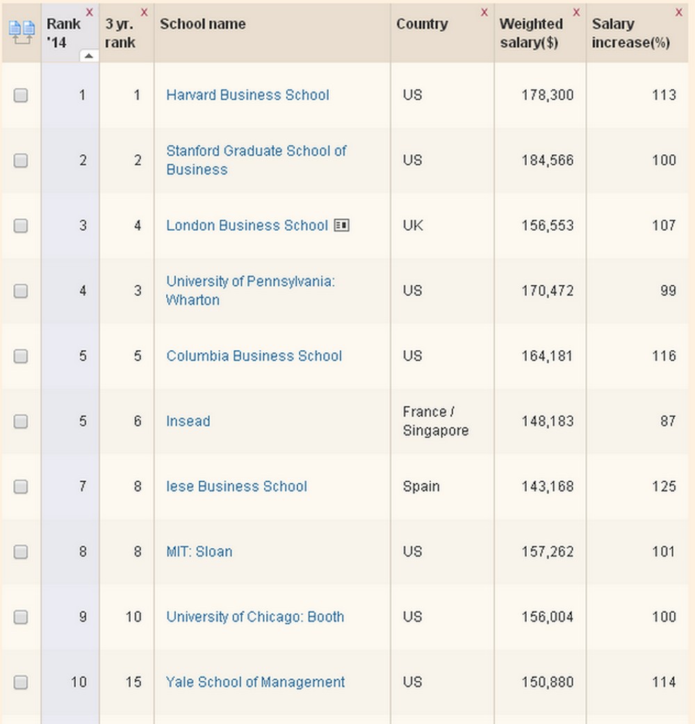 Στη λίστα περιλαμβάνονται 51 πανεπιστήμια των ΗΠΑ και 26 της Ευρώπης. Οι νέες αφίξεις στα πρώτα 100 είναι τα εξής: UC Davis, Durham, Wake Forest, BYU – Marriott, ESMT, Pitt – Katz, Shanghai Jiao Tong, and IIM – Bangalore.