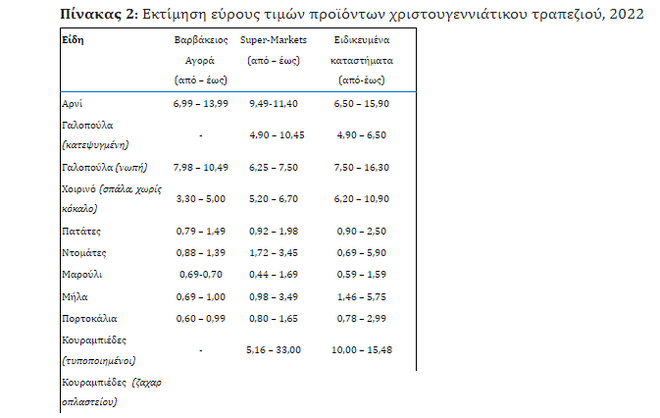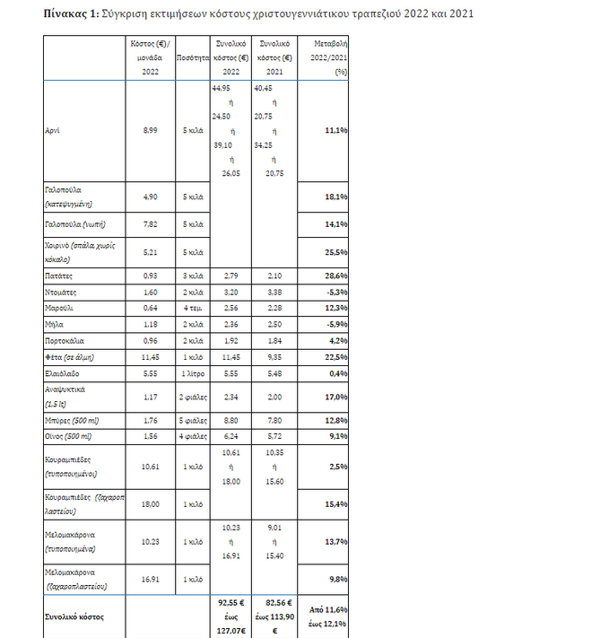 Η εκτίμηση του κόστους για το φετινό χριστουγεννιάτικο τραπέζι (6-8 ατόμων) κυμαίνεται από 92,55 έως 127,07 ευρώ. Πρόκειται για μεταβολή της τάξης του 11,6% έως 12,1% σε σύγκριση με το αντίστοιχο τραπέζι του 2021. Το εύρος των τιμών δικαιολογείται από την καταγραφή σειράς προϊόντων διαφορετικής ποιότητας, σε αρκετές τοπικές αγορές και διαφορετικούς τύπους καταστημάτων.