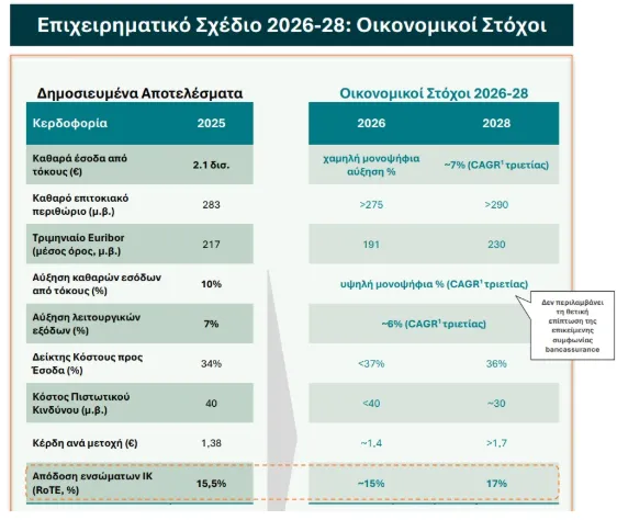 Αντλώντας οφέλη από την ισχυρή αυτή επίδοση, οι στρατηγικοί μας στόχοι, όπως αποτυπώνονται στο νέο επιχειρηματικό μας σχέδιο για την περίοδο 2026-2028, σηματοδοτούν το επόμενο στάδιο πειθαρχημένης ανάπτυξης και διαρκούς δημιουργίας αξίας. Φιλοδοξούμε να επιτύχουμε υψηλή αλλά διατηρήσιμη απόδοση ενσώματων ιδίων κεφαλαίων (RoTE), η οποία αναμένεται να ανέλθει σε 17% στο τέλος του 2028, αξιοποιώντας τις ευνοϊκές μακροοικονομικές συνθήκες προκειμένου να επιταχύνουμε την καθαρή πιστωτική επέκταση σε επίπεδα άνω των €10 δισ. εντός της επόμενης τριετίας.