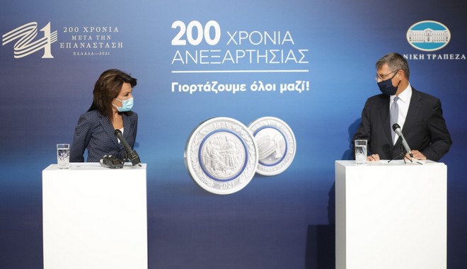 Σήμερα, με την παραλαβή του επίσημου αναμνηστικού συλλεκτικού μεταλλίου της Επιτροπής «Ελλάδα 2021», αναλαμβάνουμε την αποκλειστική του διάθεση μέσω του δικτύου καταστημάτων μας αλλά και μέσω της ιστοσελίδας της Εθνικής και δεσμευόμαστε να μάθει το ευρύ κοινό την ύπαρξη και την αξία αυτής της προσπάθειας και να τη στηρίξει – να συμμετάσχει με το να το αποκτήσει. Ο εορτασμός της ανεξαρτησίας μας θα αποτελέσει Προπομπό για ένα ακόμη καλύτερο μέλλον. Για μια Ελλάδα που όλοι οραματιζόμαστε και θέλουμε να έχουμε».