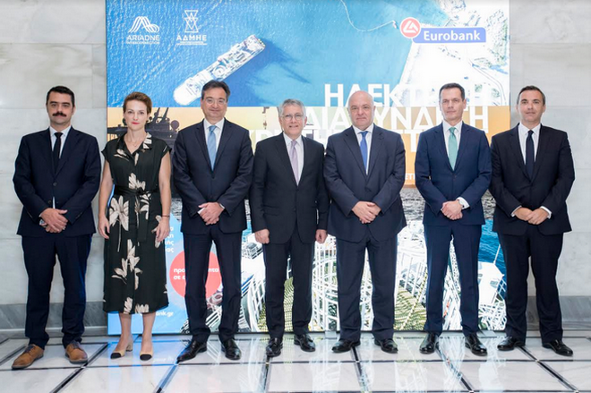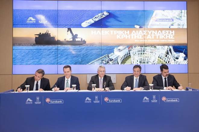 Οι διοικήσεις των τριών εταιρειών, εκπροσωπούμενες από τον Πρόεδρο και Διευθύνοντα Σύμβουλο του ΑΔΜΗΕ και Πρόεδρο της Αριάδνη Interconnection, κ. Μάνο Μανουσάκη και τον Διευθύνοντα Σύμβουλο της Eurobank, κ. Φωκίωνα Καραβία, υπέγραψαν σήμερα τη δανειακή σύμβαση με την οποία καλύπτεται αποκλειστικά από την Eurobank το δανειακό σκέλος της χρηματοδότησης του έργου, σε ειδική τελετή που πραγματοποιήθηκε παρουσία του υφυπουργού Περιβάλλοντος και Ενέργειας, κ. Γεράσιμου Θωμά και της Γενικής Γραμματέως Ενέργειας και Ορυκτών Πρώτων Υλών, κας Αλεξάνδρας Σδούκου.