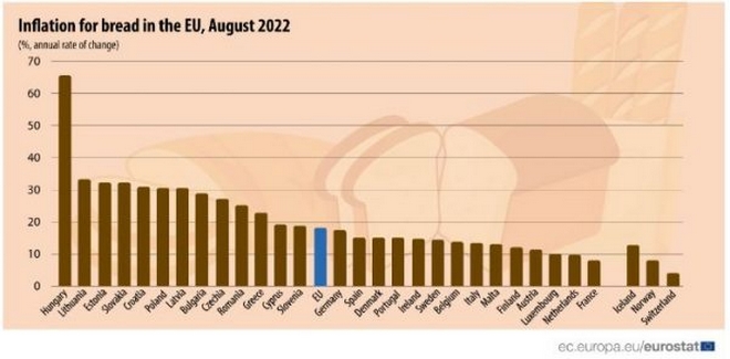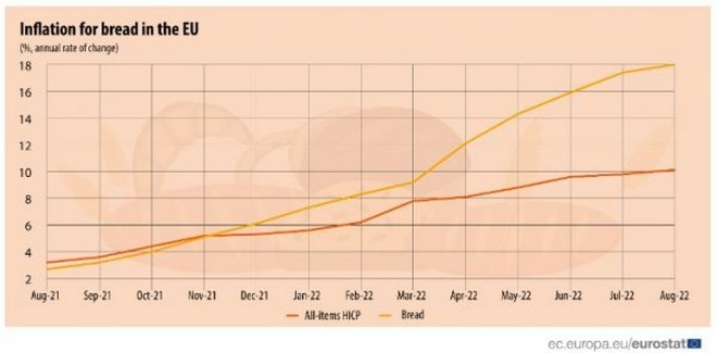 Η μέση τιμή του ψωμιού στην ΕΕ ήταν κατά 18% υψηλότερη τον Αύγουστο, σε σύγκριση με την προηγούμενη χρονιά, με βάση στοιχεία της Eurostat. Αυτή είναι η μεγαλύτερη αύξηση από τον Δεκέμβριο του 2017, όταν η Eurostat ξεκίνησε να κρατά στατιστικά στοιχεία. Τον Αύγουστο του 2021 η μέση τιμή του ψωμιού αυξήθηκε κατά 3% σε ετήσια βάση.