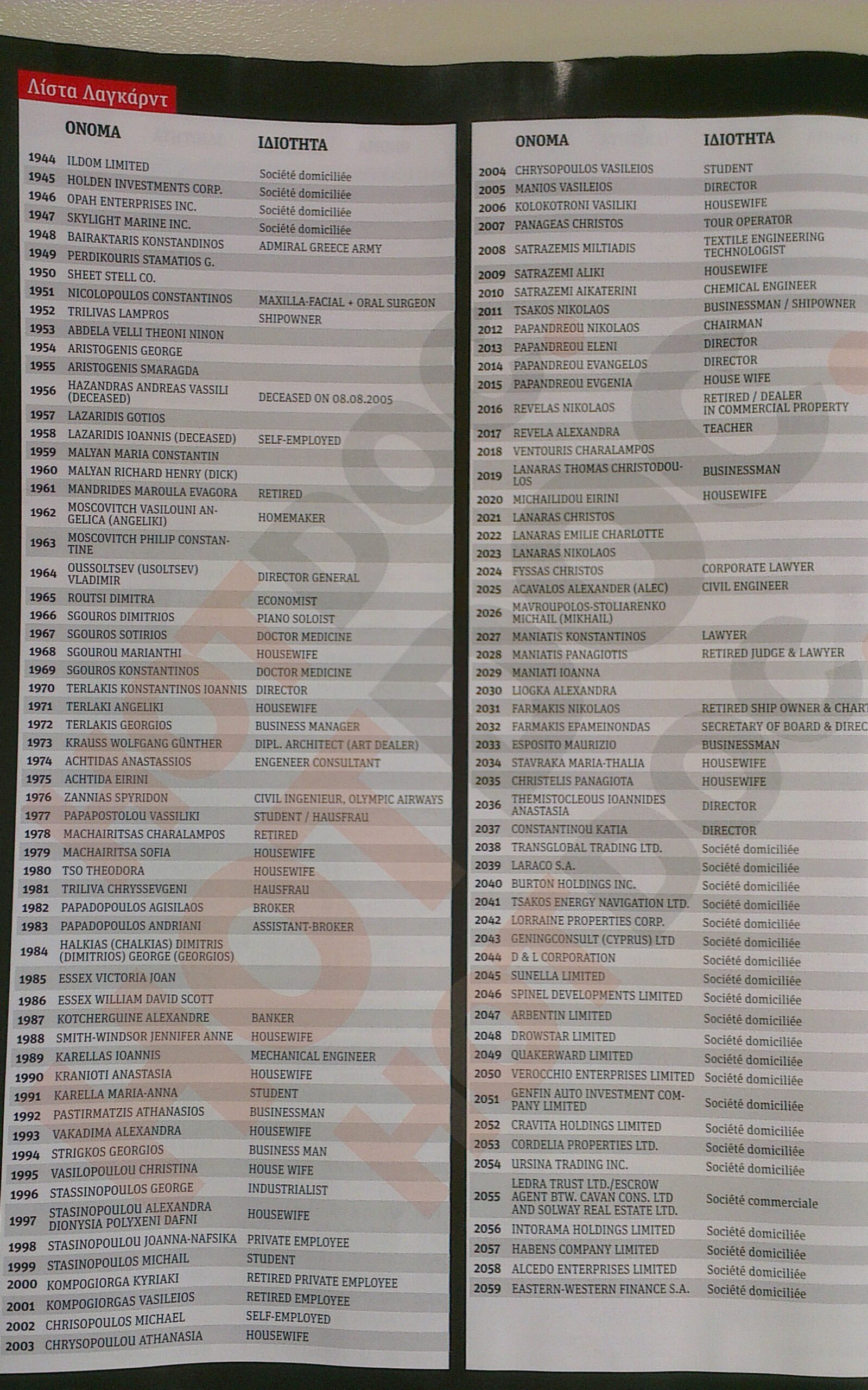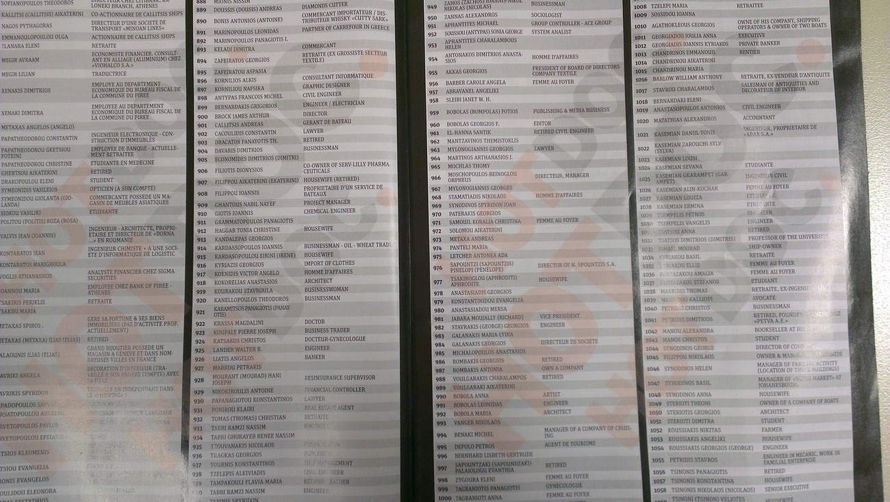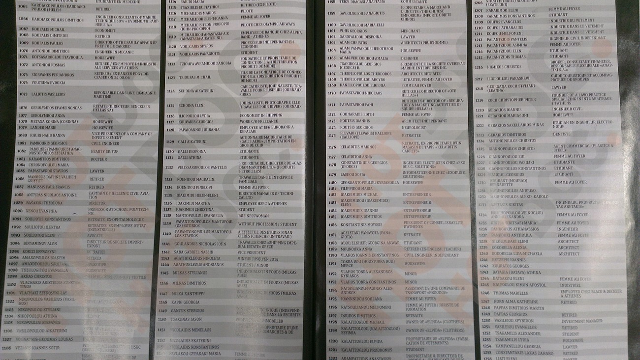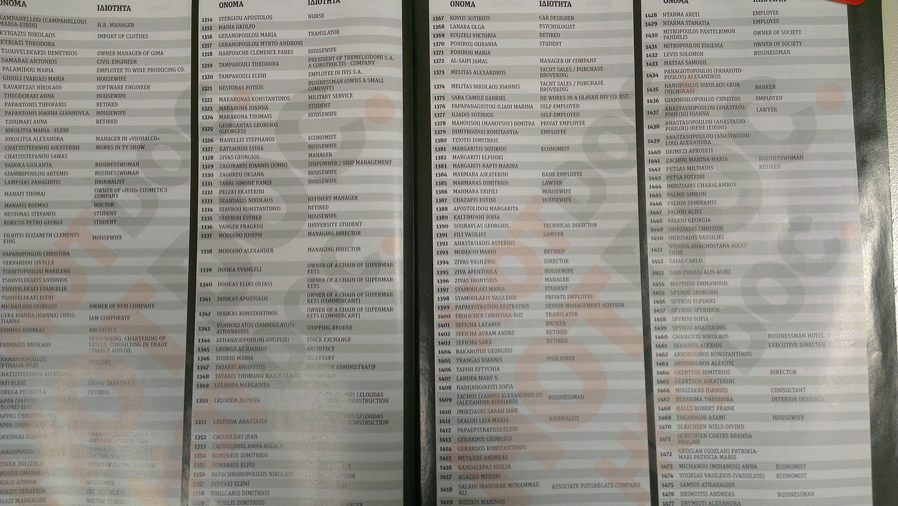 Στη λίστα, που σε καμία περίπτωση δεν αποτελεί απόδειξη διάπραξης παράνομων ενεργειών από τα 2059 ονόματα που αναφέρονται, περιλαμβάνονται επιχειρηματίες, δημοσιογράφοι, πολιτικοί, εκδότες αλλά και φοιτητές, έμποροι και πολλοί κοσμηματοπώλες.