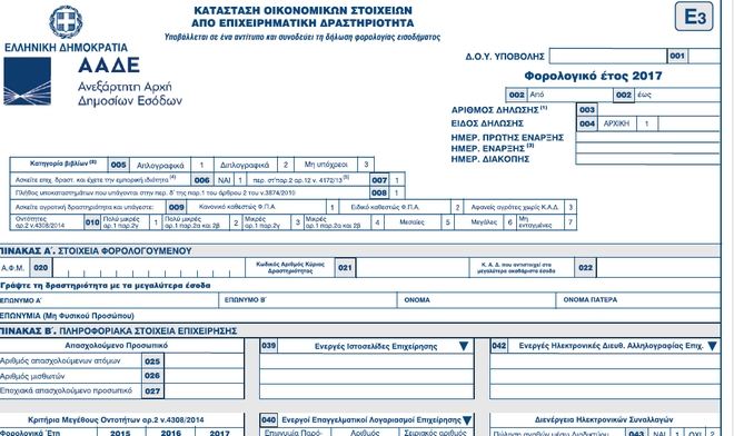 Το νέο Ε3 έχει επίσης προσαρμοστεί στις διατάξεις περί Ελληνικών Λογιστικών Προτύπων του ν.4308/2014, καθώς και για να αποτυπωθούν σε αυτό με πληρέστερο τρόπο τα αποτελέσματα και το σύνολο των οικονομικών πληροφοριών των επιχειρήσεων. Στην κατεύθυνση αυτή, έχουν συμπεριληφθεί δυναμικοί πίνακες, όπου αναλύονται οι αναγραφόμενες οικονομικές πληροφορίες της επιχείρησης (αγορές, πωλήσεις, έξοδα κ.λπ.).