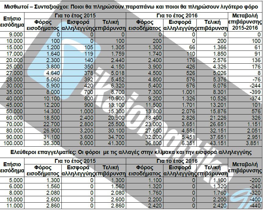 γ) Θα καθιερωθούν συντελεστές φόρου 29% για το τμήμα ετησίου εισοδήματος από 20.001 έως 30.000 ευρώ, 37% για το τμήμα ετησίου εισοδήματος από 30.001 έως 40.000 ευρώ και 45% για το τμήμα του ετησίου εισοδήματος πάνω από τα 40.000 ευρώ. Αποτέλεσμα των αλλαγών αυτών θα είναι να μειωθεί το ετήσιο αφορολόγητο όριο των μισθών και των συντάξεων από τα 9.545 στα 9.090 ευρώ, να προκύψουν για πρώτη φορά επιβαρύνσεις για όσους δηλώνουν εισοδήματα από 9.090 έως 9.545 ευρώ το χρόνο και να αυξηθούν οι υφιστάμενες επιβαρύνσεις για όλους όσοι δηλώνουν πάνω από 9.545 ευρώ.