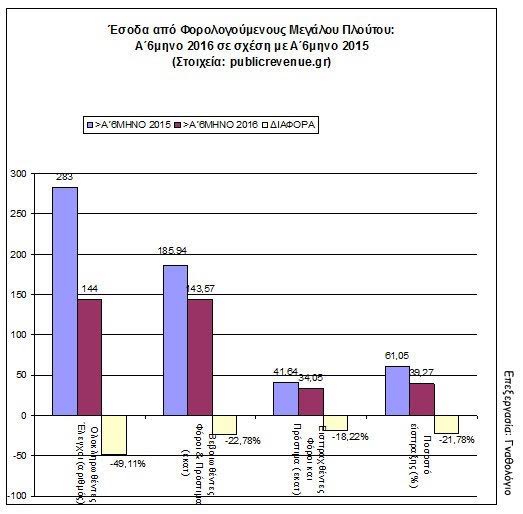 Τα στοιχεία της ΓΓΔΕ για την εξέλιξη των ελέγχων είναι ενδεικτικά . Το πρώτο εξάμηνο του 2016 έγιναν 143 έλεγχοι σε φορολογούμενους μεγάλου πλούτου ενώ το ίδιο διάστημα του 2015 είχαν γίνει 284 δηλαδή σχεδόν διπλάσιοι . Από τους ελέγχους που έγιναν βεβαιώθηκαν το πρώτο εξάμηνο του 2016 φόροι 143,6 εκ ευρώ ενώ το ίδιο διάστημα πέρσι είχαν βεβαιωθεί φόροι 184,9 εκ ευρώ. Από τους βεβαιωθέντες φόρους εισπράχθηκαν φέτος 41,05 εκ ευρώ ( ποσοστό 61,05% επι του συνόλου ) έναντι 34,05 εκ ευρώ το ίδιο διάστημα πέρσι .