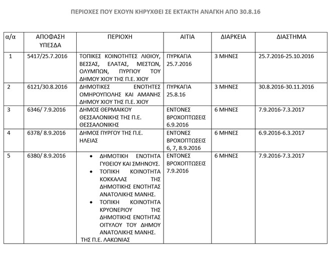 Οι αποφάσεις αυτές εκδόθηκαν, βάσει σχετικών αποφάσεων του Υπουργείου Εσωτερικών και Διοικητικής Ανασυγκρότησης (Γενική Γραμματεία Πολιτικής Προστασίας) το οποίο και κηρύσσει την κατάσταση Έκτακτης Ανάγκης Πολιτικής Προστασίας, την περιοχή και το χρονικό διάστημα.